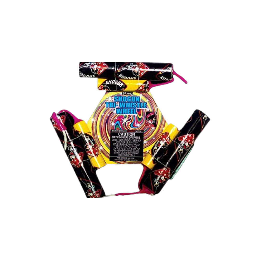 Light up the night with the exciting Shogun Whistling Tri Rotation Wheel! This fast-spinning aerial wheel creates a dazzling display as it whirls with powerful motion, colorful sparks, and a loud whistling effect that grabs everyone’s attention. Designed to spin rapidly with three points of rotation, it delivers a thrilling show of sound and light for any celebration. Perfect for backyard parties or festive gatherings, this wheel is sure to add excitement to your fireworks lineup.